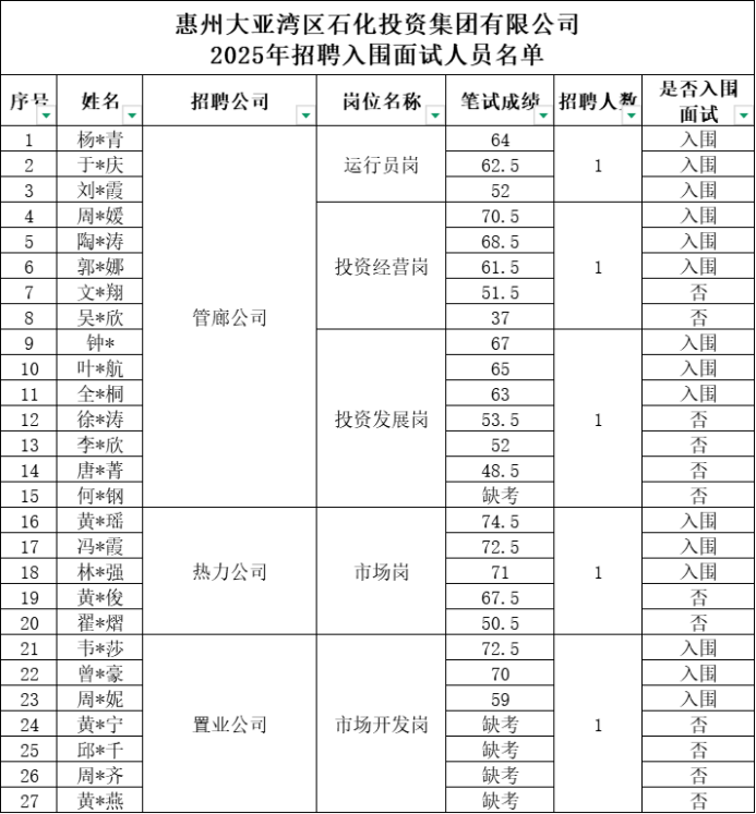 附件:惠州大亞灣區(qū)石化投資集團有限公司2025年招聘入圍面試人員名單