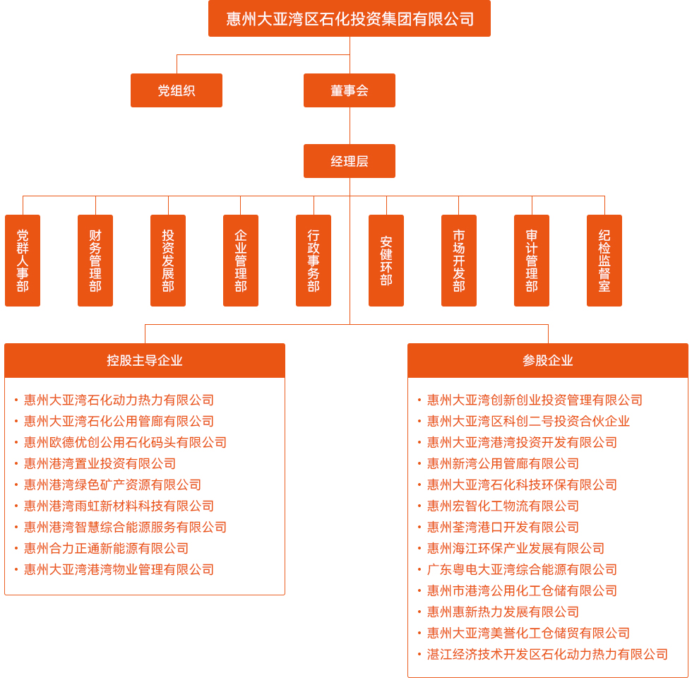 惠州大亞灣區(qū)石化投資集團有限公司(簡稱石化投資集團)成立于2008年5月,是大亞灣區(qū)屬國有獨資企業(yè),截至目前公司注冊資本31.06億元,旗下全資、控股、參股企業(yè)共 22 家。公司自成立以來,始終秉持“為世界級綠色石化高地提供一流的公用配套服務(wù)”使命,主要布局綜合能源、物流輸送、生產(chǎn)服務(wù)、重點工程、石化及新材料五大業(yè)務(wù)版塊,聚焦完善集中供熱、管廊、碼頭、倉儲等建設(shè)運營,打造“即插即用”的綜合配套體系,助推大亞灣石化區(qū)加速建成“六個一流”的世界級綠色石化產(chǎn)業(yè)高地。