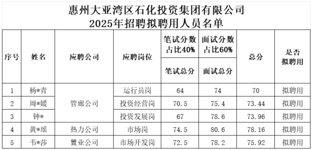 附件:惠州大亞灣區(qū)石化投資集團(tuán)有限公司2025年招聘擬聘用人員名單